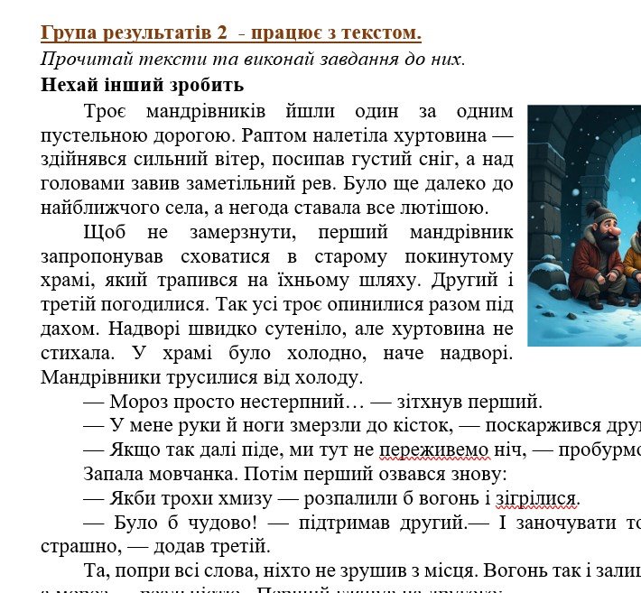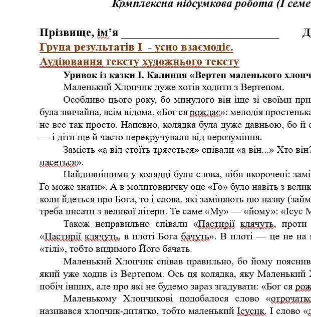 - ГР 1 – аудіювання тексту художнього стилю (уривок із казки І. Калинця “Вертеп маленького хлопчика) або ТРИ завдання на вибір для усної взаємодії;