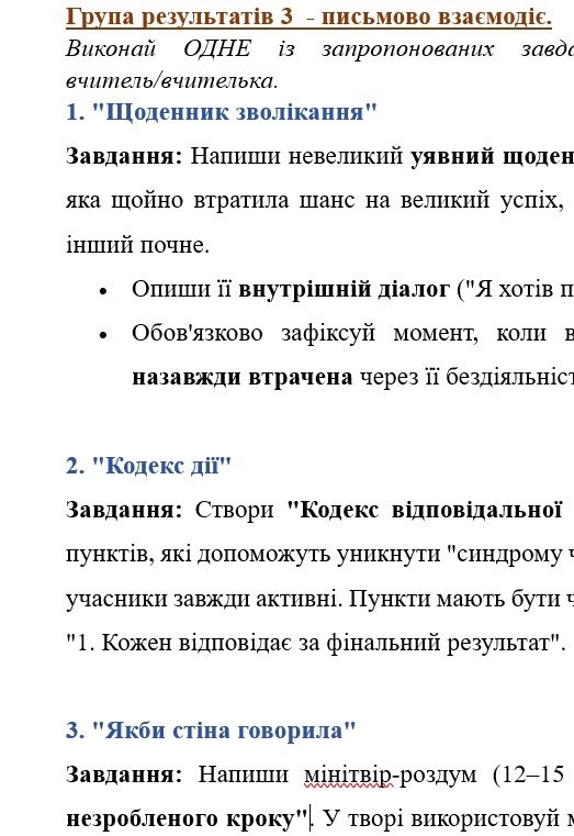 - ГР 3 – ТРИ завдання для письмової взаємодії на вибір (написання креативних творчих робіт “Щоденник зволікання”, “Кодекс дії”, “Якби стіна говорила”);
