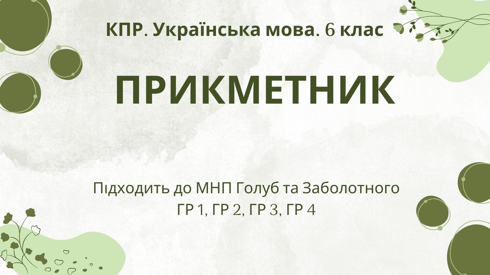 6 клас. Українська мова. Комплексна підсумкова робота з української мови «Прикметник» за чотирма групами результатів (УВ, ПТ, ПВ, ДМ). Кожну групу результатів можна оцінити від 1 до 12 балів. Учитель/учителька може проводити роботу як за всіма групами результатів, так і за одним або декількома (в залежності від обраної моделі оцінювання здобувачів освіти).