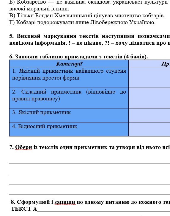 ГР 2 – робота над двома короткими текстами (тестові завдання для перевірки розуміння текстів, завдання, пов’язані з темою «Прикметник»).