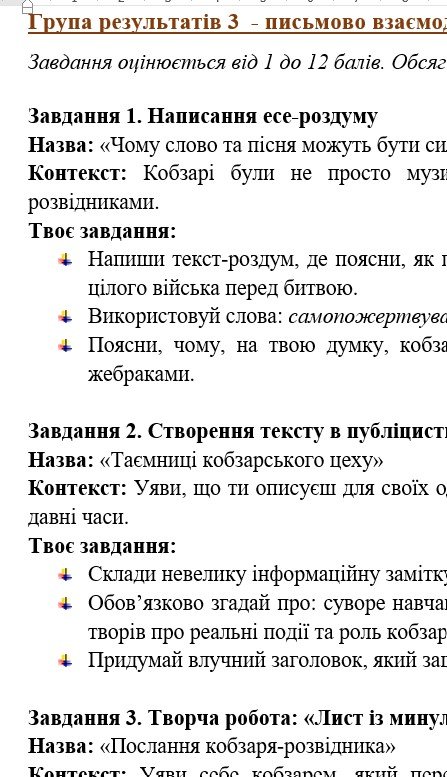 ГР 3 – три завдання на вибір (написання есе-роздуму, статті до стінгазети, творча робота “Лист із минулого”);.