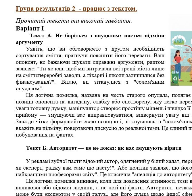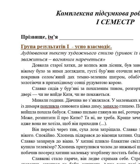 - ГР 1 – аудіювання тексту художнього стилю АБО три завдання на вибір учителя/ьки або учня/ениці для усної індивідуальної взаємодії – 2 варіанти;