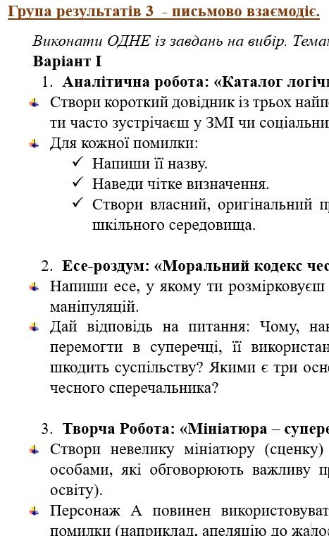 - ГР 3 – три завдання на вибір учителя/ьки або учня/ениці (написання цікавих та креативних творчих робіт) – 2 варіанти;