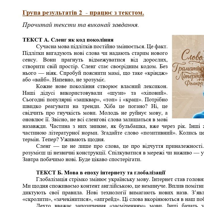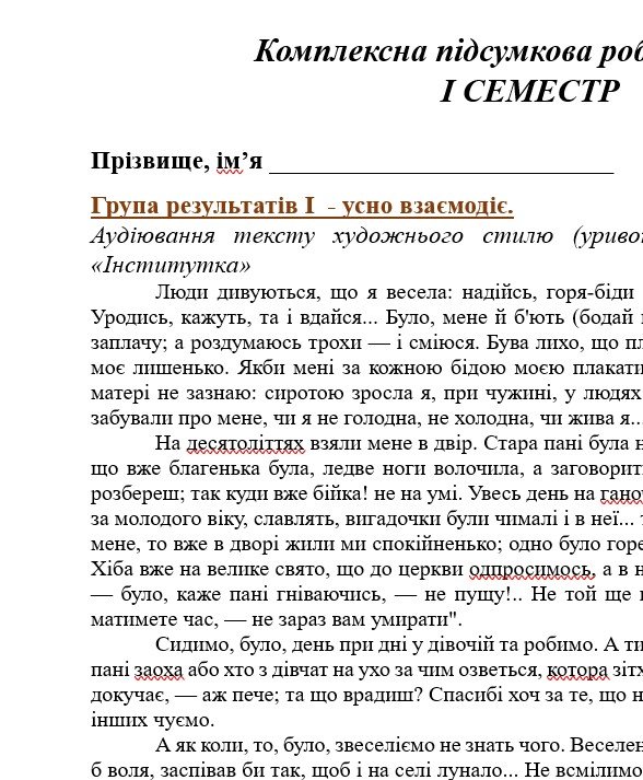 - ГР 1 – аудіювання тексту художнього стилю АБО три завдання на вибір учителя/ьки або учня/ениці для усної індивідуальної взаємодії – 2 варіанти;