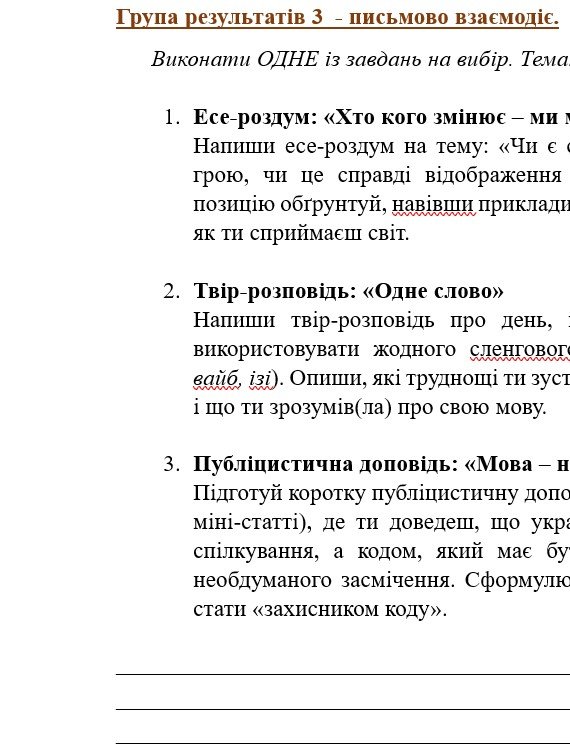 - ГР 3 – три завдання на вибір учителя/ьки або учня/ениці (написання цікавих та креативних творчих робіт) – 2 варіанти;