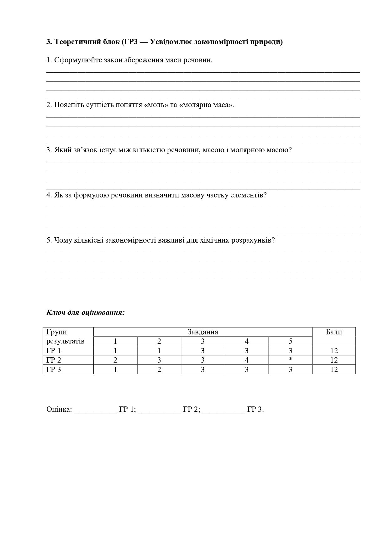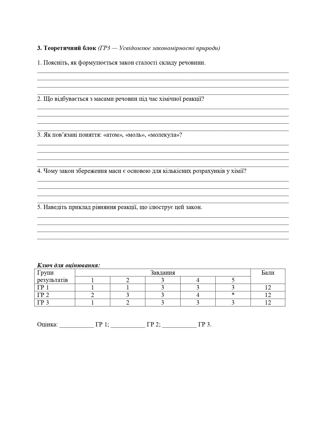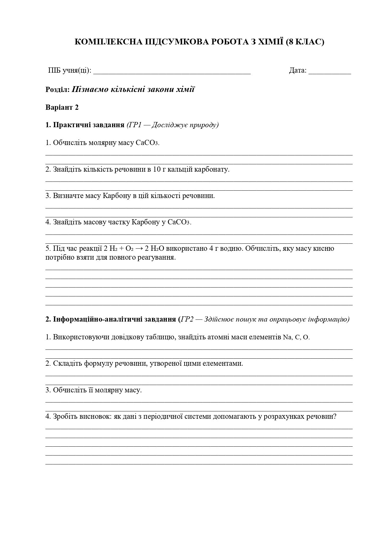 Пропоную бланки для друку для комплексної підсумкової роботи з хімії у 8 класі до розділу “Пізнаємо кількісні закони хімії” на ІІ варіанти за трьома групами результатів.