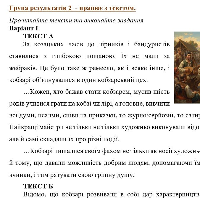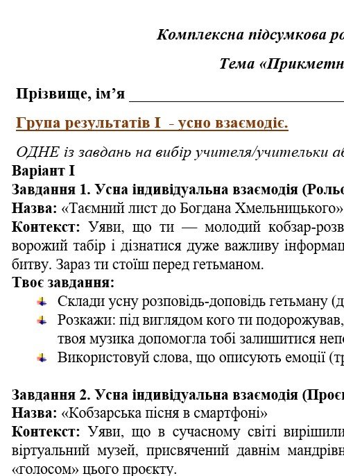 ГР 1 – три ситуативні завдання на вибір учителя/учительки або учня/учениці (рольова гра, проєкт-дослідження, парна робота – діалог та ін.) – 2 варіанти.