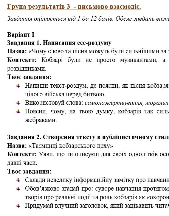 ГР 3 – три завдання на вибір (написання есе-роздуму, статті до стінгазети, творча робота “Лист із минулого” та ін) – 2 варіанти;.