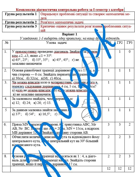 Комплексна підсумкова робота за І семестр з геометрії 8 клас НУШ з відповідями за програмою О.Істера