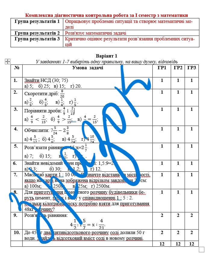 Комплексна підсумкова робота за І семестр з математики 6 клас НУШ з відповідями за програмою Н.Тарасенкової та А.Мерзляка з групами результатів . Охоплює такі теми: