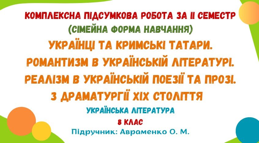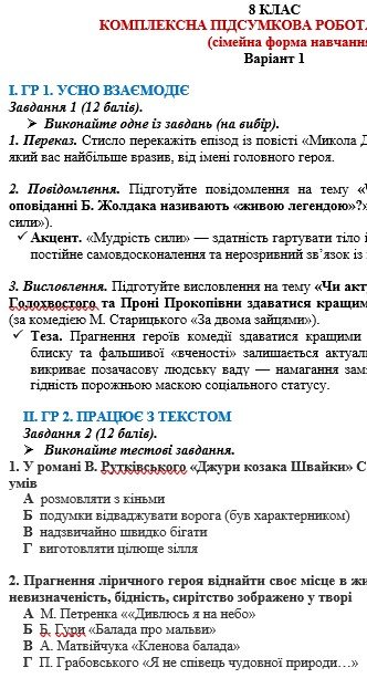 Комплексна підсумкова робота за ІІ семестр з української літератури розроблена для учнів 8 класу, які здобувають освіту за сімейною формою навчання (модельна навчальна програма «Українська література. 7–9 класи» для закладів загальної середньої освіти (автори: Яценко Т. О., Пахаренко В. І., Слижук О. А., Тригуб І. А.)).