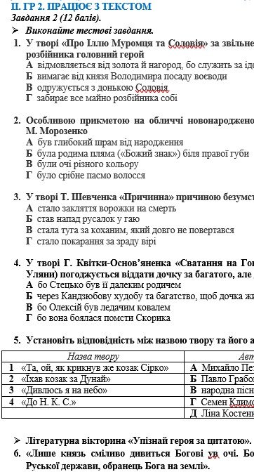 2 варіанти. ЧОТИРИ ГРУПИ РЕЗУЛЬТАТІВ. ГР 1. Усно взаємодіє – аудіювання тексту, переказ, висловлення (одна робота на вибір). ГР 2. Працює з текстом – 4 тестові завдання закритого типу, 1 завдання на встановлення відповідності, 4 завдання літературної вікторини “Упізнай героя”. ГР 3. Письмово взаємодіє – написання відгуку на художній твір. ГР 4. Досліджує мовлення – 6 тестових завдань закритого типу, 1 на встановлення відповідності, 1 – робота з таблицею.