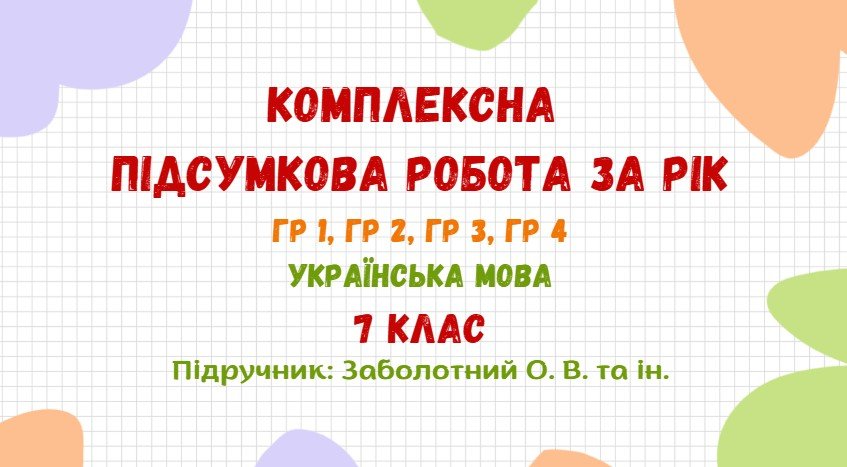Комплексна підсумкова робота з української мови за рік розроблена для учнів 7 класу (модельна навчальна програма «Українська мова. 7-9 класи» для закладів загальної середньої освіти (автори: Заболотний О. В., Заболотний В. В., Лавринчук В. П., Плівачук К. В., Попова Т. Д.)).