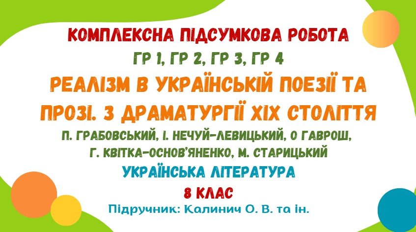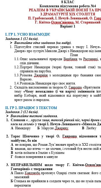 Комплексна підсумкова робота з української літератури розроблена для учнів 8 класу, які вивчили тему “РЕАЛІЗМ В УКРАЇНСЬКІЙ ПОЕЗІЇ ТА ПРОЗІ. З ДРАМАТУРГІЇ ХІХ СТОЛІТТЯ П. Грабовський, І. Нечуй-Левицький, О. Гаврош, Г. Квітка-Основ’яненко, М. Старицький” (модельна навчальна програма «Українська література. 7–9 класи» для закладів загальної середньої освіти (автори: Яценко Т. О., Пахаренко В. І., Слижук О. А., Тригуб І. А.)).