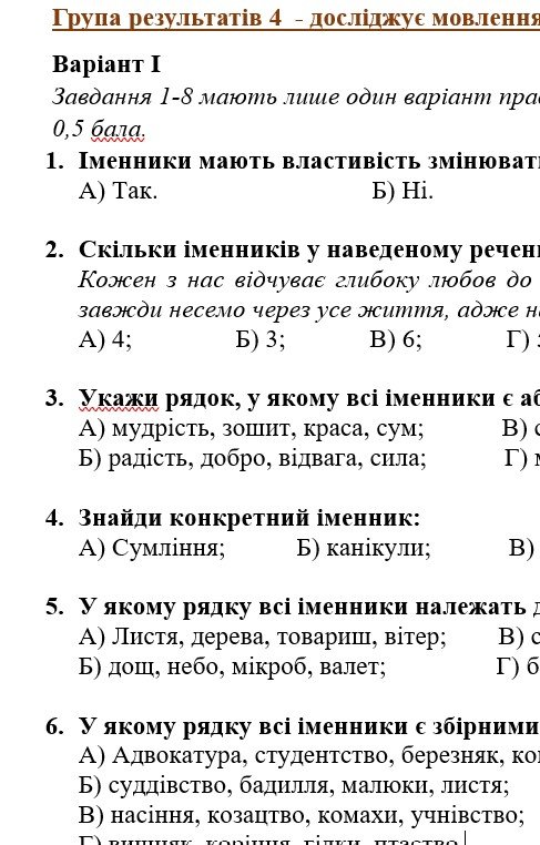 Комплексна підсумкова робота з української мови для 6 кл. Чотири групи результатів.Тема “Іменник” (ч.1.) МНП Голуб. Теми, що охоплює КПР: іменники конкретні й абстрактні, назви істот і неістот, велика літера й лапки у власних назвах, незмінювані іменники, рід, число, відмінки іменників.