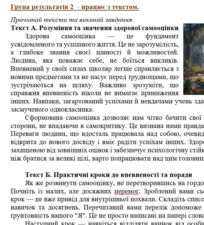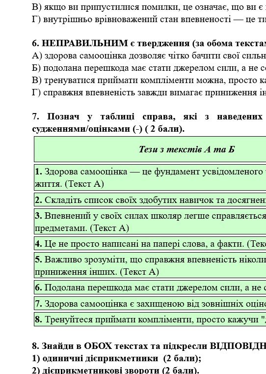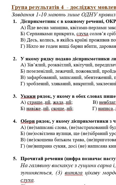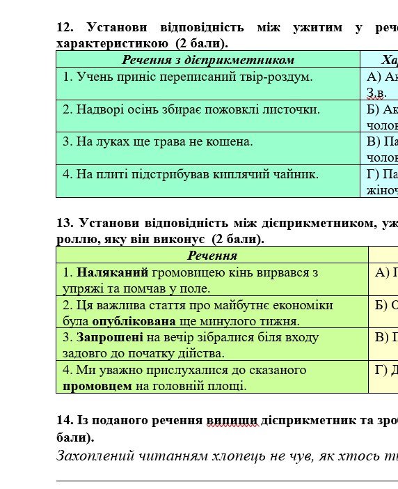 - ГР 2 – два тексти, об’єднані спільною темою та завдання до них: тестові завдання на розуміння текстів, твердження/судження, завдання, пов’язані з темою “Дієприкметник”;