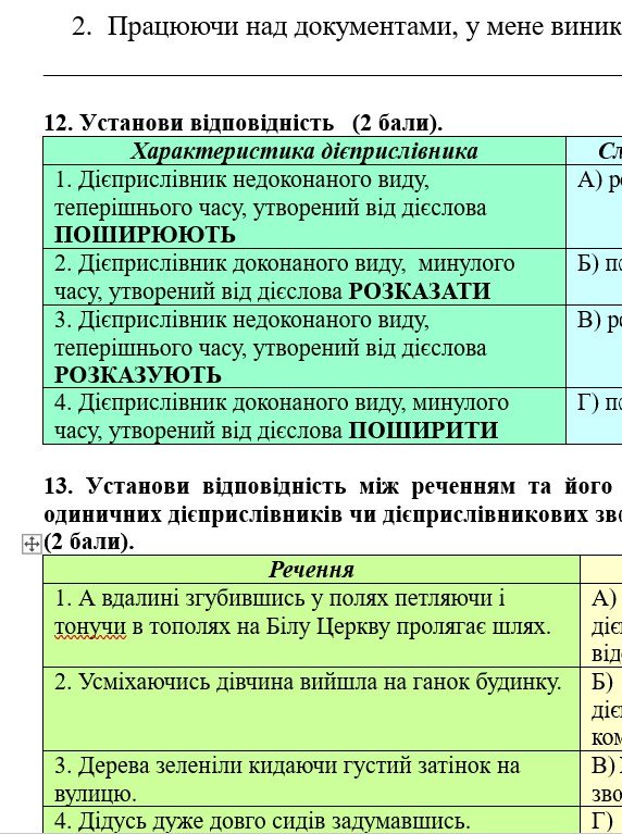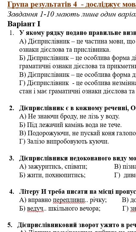- ГР 4 – тестові завдання, завдання на встановлення відповідностей, морфологічний розбір дієприслівника – 2 варіанти.