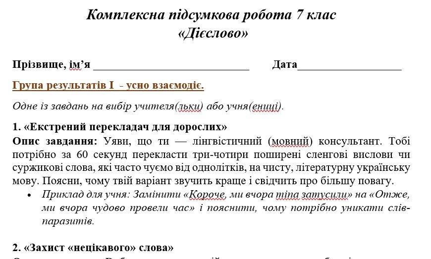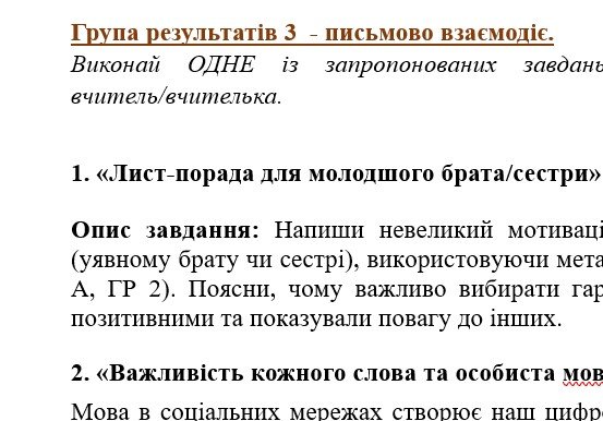 - ГР 3 – три завдання на вибір учителя/ьки або учня/ениці (написання творчих робіт): «Лист-порада для молодшого брата/сестри», «Важливість кожного слова та особиста мовна культура», «Створення власного мовного Кодексу» (з поясненнями);