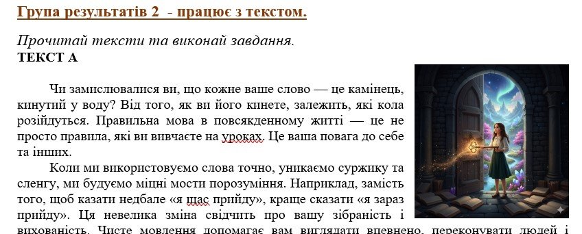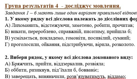 - ГР 2 – два тексти, об’єднані спільною темою та завдання до них: тестові завдання на розуміння текстів та завдання, пов’язані з темою “Дієслово”;