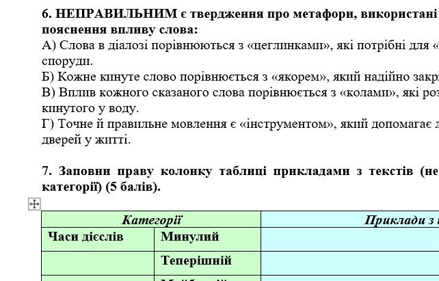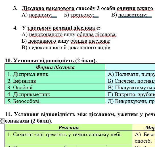 - ГР 4 – тестові завдання, текст із семи речень та завдання до нього, завдання на відповідності, морфологічний розбір дієслова.