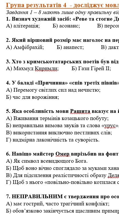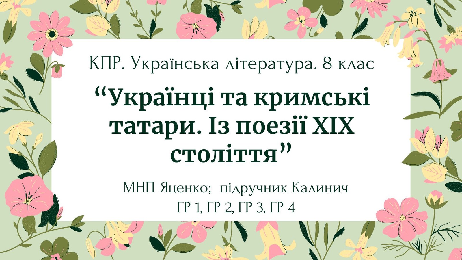Комплексна ПР. 8 клас. Укр. література. “Українці та кримські татари. Із поезії ХІХ ст”(МНП Яценко) ГР 1, ГР 2, ГР 3, ГР 4 Підручник Калинич