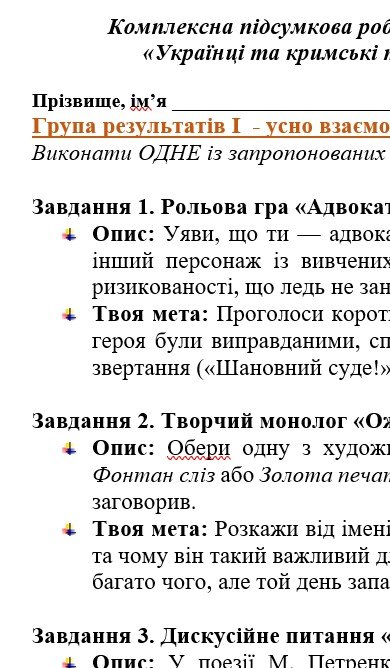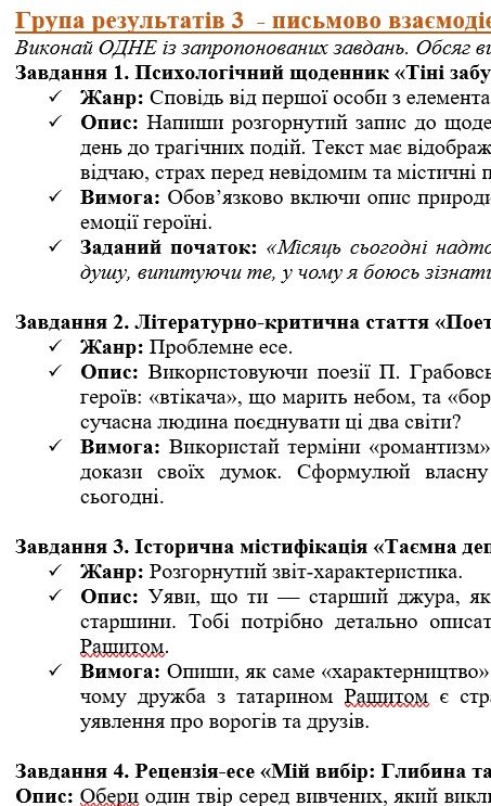 - ГР 3 – ТРИ завдання на вибір учня/учениці (або вчителя/ьки) (написання креативних творчих робіт за тематикою розділу);