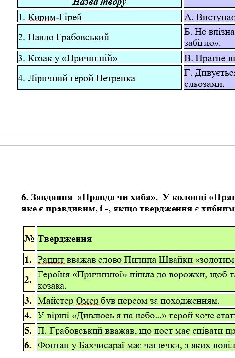 - ГР 2 – тестові завдання, завдання на встановлення відповідності, завдання “Правда чи хиба”;