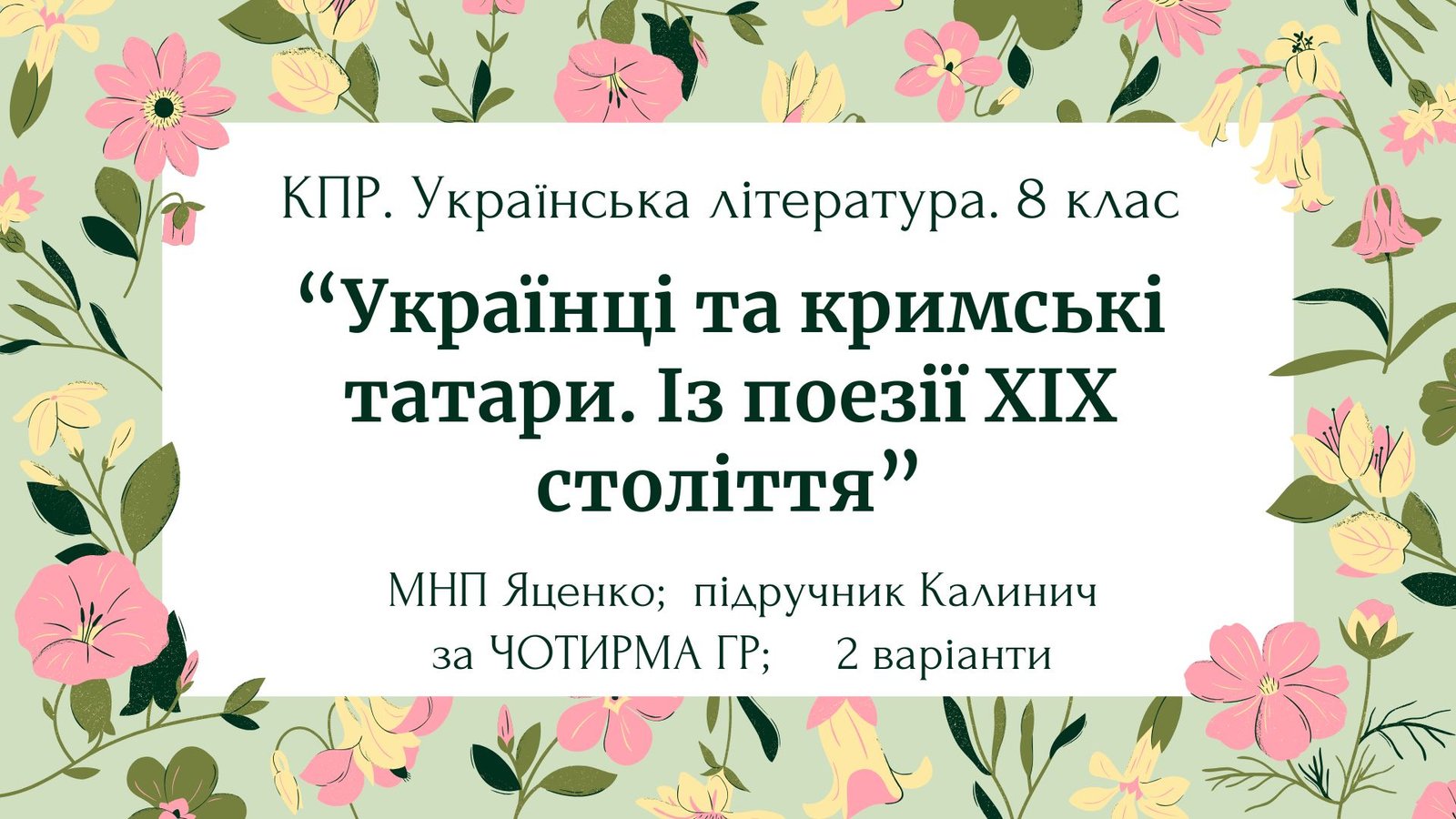 Комплексна ПР. 8 клас. Укр. література. “Українці та кримські татари. Із поезії ХІХ ст”(МНП Яценко) за ЧОТИРМА ГР Підручник Калинич 2 варіанти