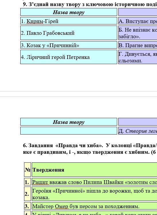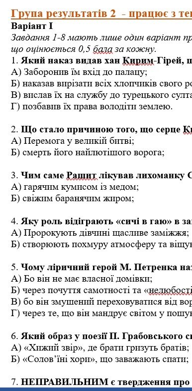 - ГР 2 – тестові завдання, завдання на встановлення відповідності, завдання “Правда чи хиба” – 2 варіанти;