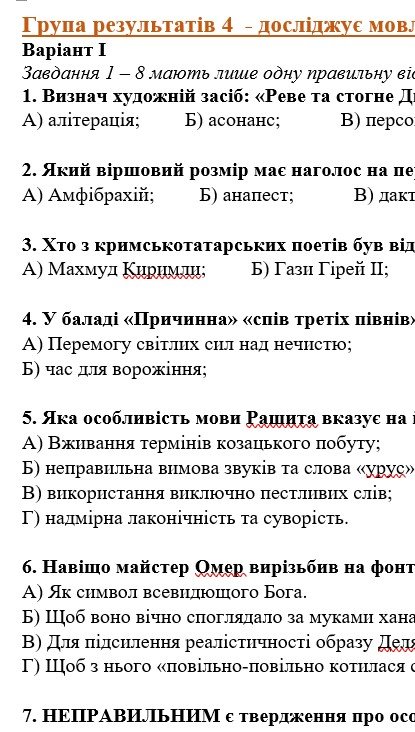 Комплексна підсумкова робота з української літератури для 8 класу НУШ “Українці та кримські татари. Із поезії ХІХ століття” за ЧОТИРМА ГР МНП Яценко, підручник Калинич