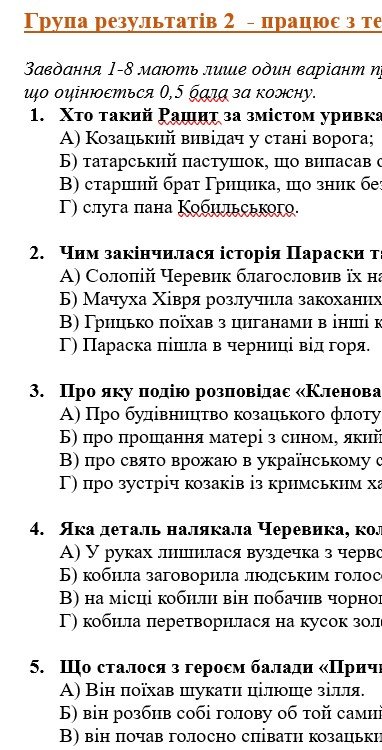 - ГР 4 – тестові завдання, завдання на встановлення відповідностей, завдання з відкритою відповіддю (ТРИ на вибір).
