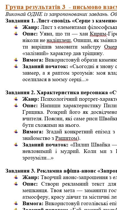 - ГР 3 – ЧОТИРИ завдання на вибір учня/учениці (або вчителя/ьки) (написання креативних творчих робіт за тематикою розділу);