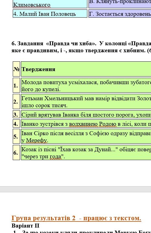 - ГР 2 – тестові завдання, завдання на встановлення відповідності, завдання “Правда чи хиба” – 2 варіанти;