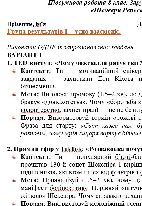 Комплексна підсумкова робота із зарубіжної літератури для 8 класу НУШ “Шедеври Ренесансу” ГР 1, ГР 2, ГР 3, ГР 4. МНП Ніколенко, підручник Ніколенко.