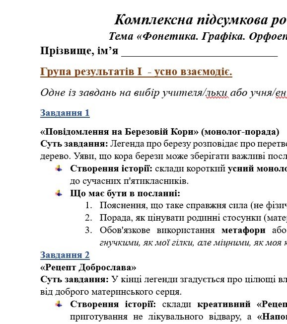 Комплексна підсумкова робота з української мови для 5 класу за чотирма ГР, за модельною навчальною програмою Голуб “Фонетика. Графіка. Орфоепія. Орфографія”