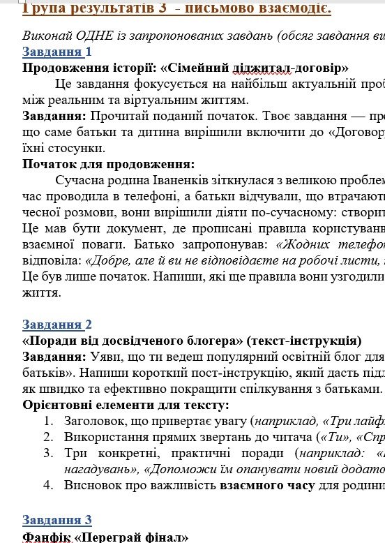 - ГР 1 – ТРИ завдання (на вибір учителя або учня) для усної взаємодії (пов’язані за тематикою з текстом в ГР 2);