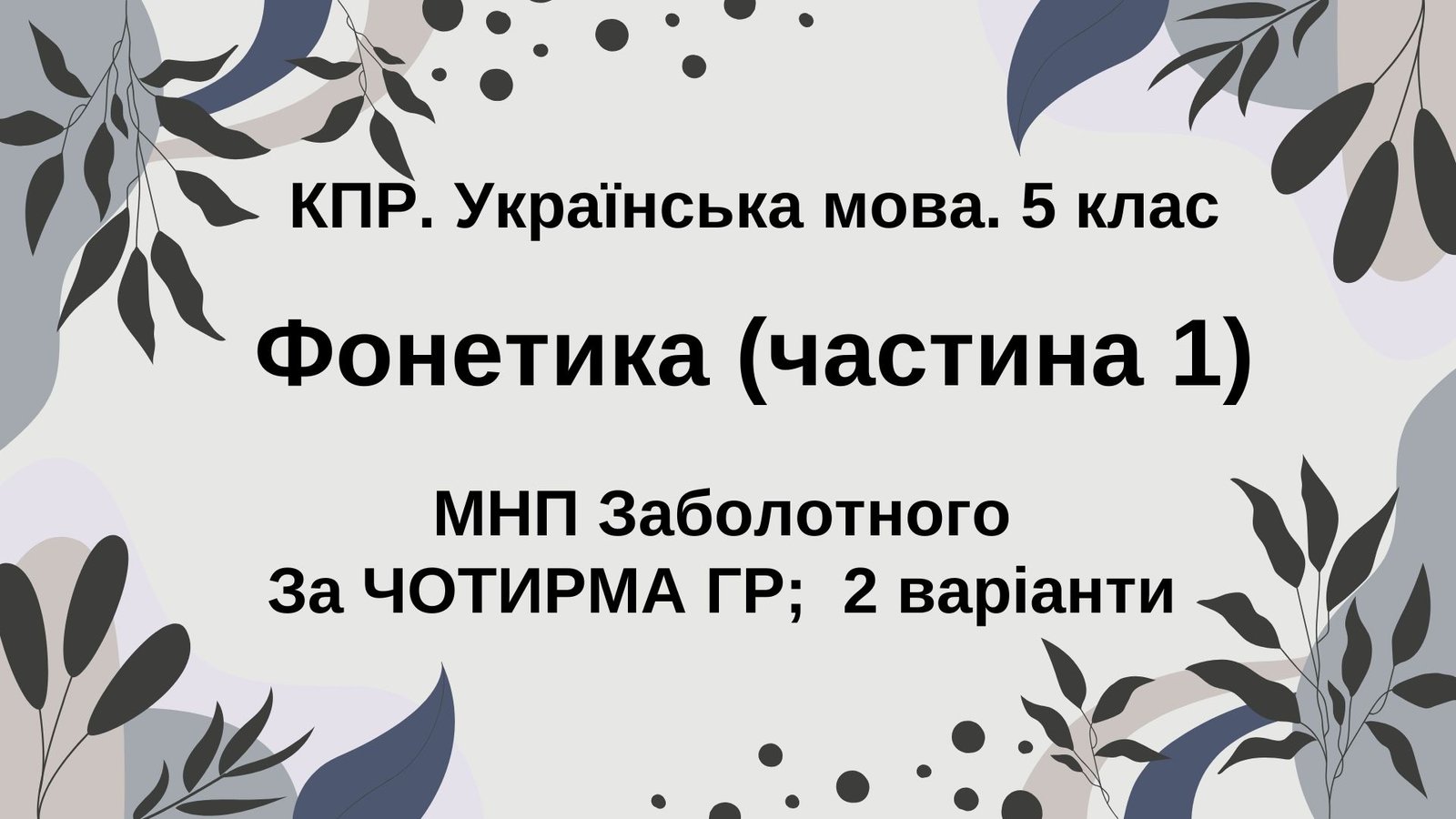 Комплексна ПР. Укр. мова. 5 клас. “Фонетика. Графіка. Орфоепія. Орфографія”. ГР 1, ГР 2, ГР 3, ГР 4; (МНП Заболотного, частина 1)