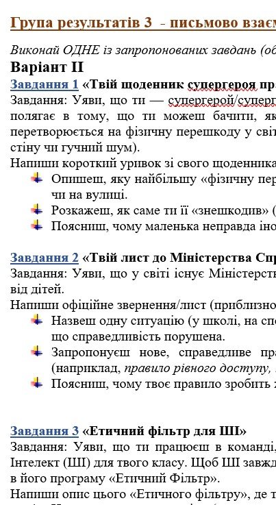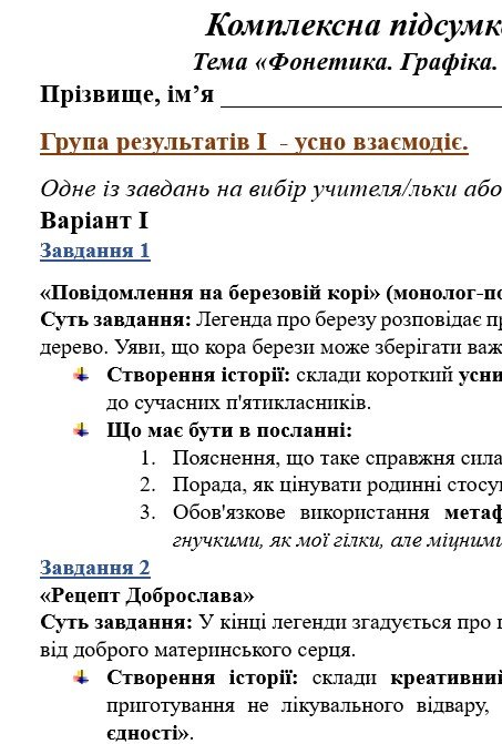 - ГР 1 – ТРИ завдання (на вибір учителя або учня) для усної взаємодії (пов’язані за тематикою з текстом в ГР 2) – 2 варіанти;