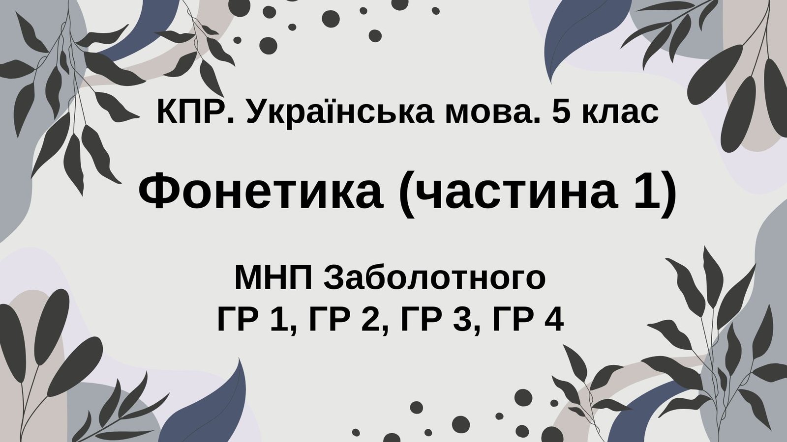 Комплексна ПР. Укр. мова. 5 клас. “Фонетика. Графіка. Орфоепія. Орфографія”. ГР 1, ГР 2, ГР 3, ГР 4; (МНП Заболотного)