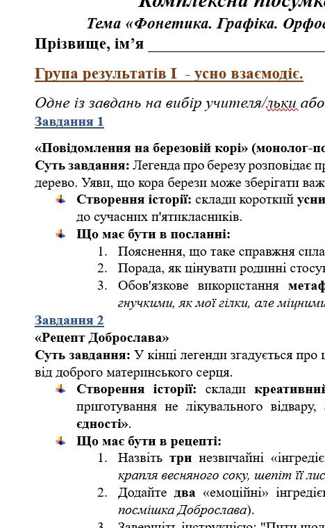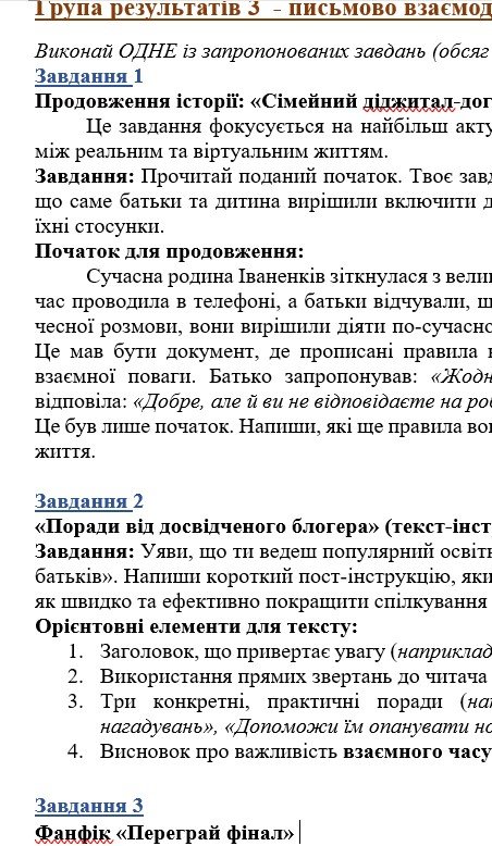- ГР 1 – ТРИ завдання (на вибір учителя або учня) для усної взаємодії (пов’язані за тематикою з текстом в ГР 2);