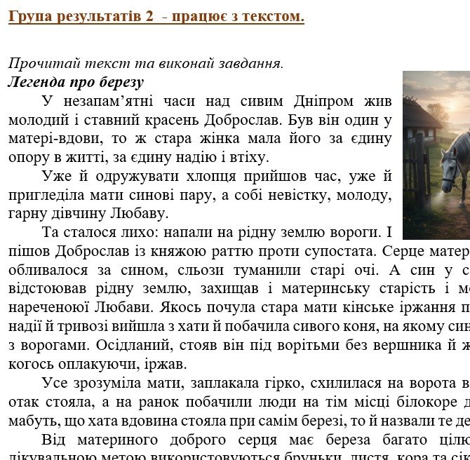 - ГР 2 – текст (легенда) та завдання до нього (на розуміння тексту та з вивчених мовних тем);