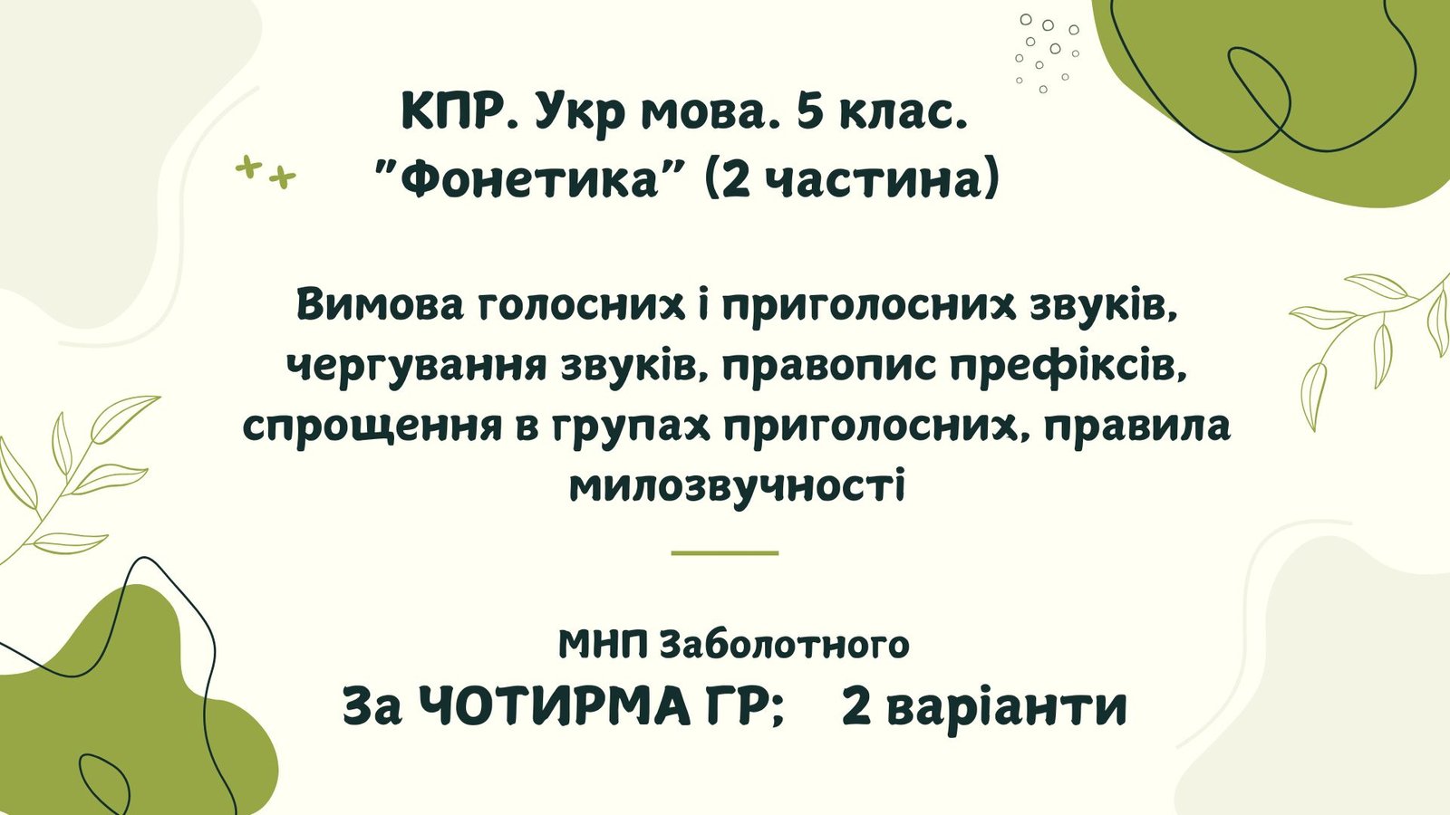Комплексна ПР. Укр. мова. 5 клас “Фонетика. Графіка. Орфоепія. Орфографія” ІІ частина; ГР 1, ГР 2, ГР 3, ГР 4; МНП Заболотного