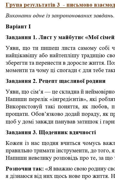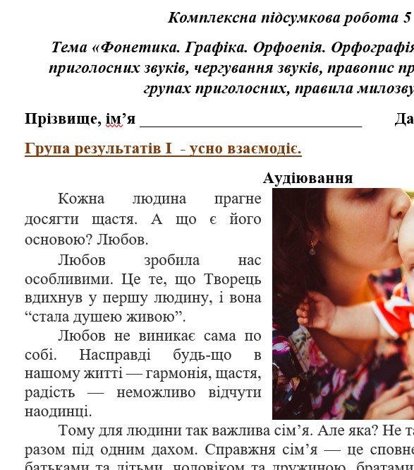 - ГР 1 – аудіювання тексту публіцистичного стилю (про важливість сім’ї) – 2 варіанти;