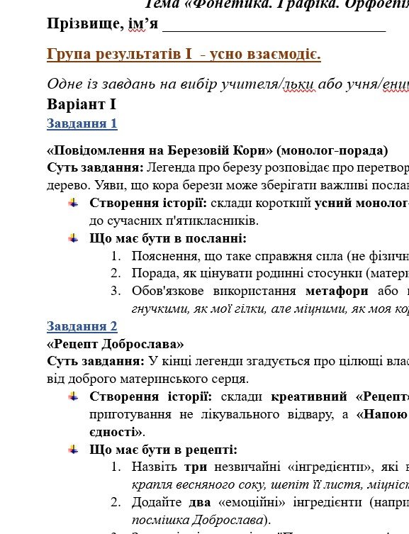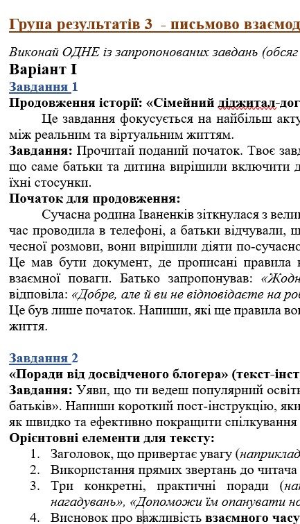 - ГР 1 – по три завдання в кожному варіанті (на вибір учителя або учня) для усної взаємодії (пов’язані за тематикою з текстами в ГР 2);