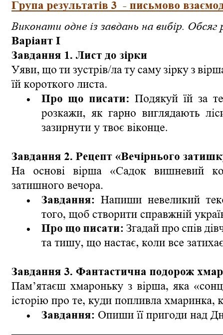 ГР 3 – три завдання (одне на вибір) для написання творчих робіт – 2 варіанти;