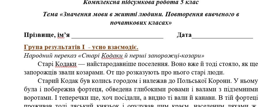 5 клас. Українська мова. Комплексна підсумкова робота № 1 “Повторення та узагальнення вивче...