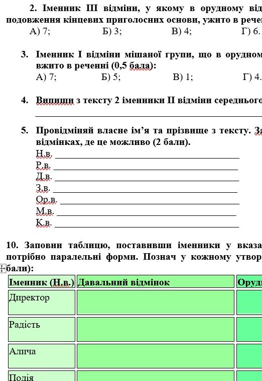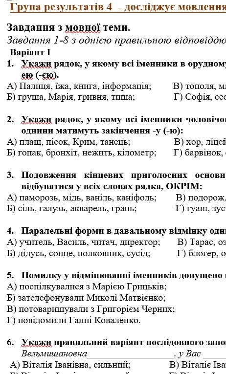 ГР 4 – тестові завдання, завдання до короткого тексту, відмінювання прізвища та імені, правопис відмінкових закінчень іменників – 2 варіанти.