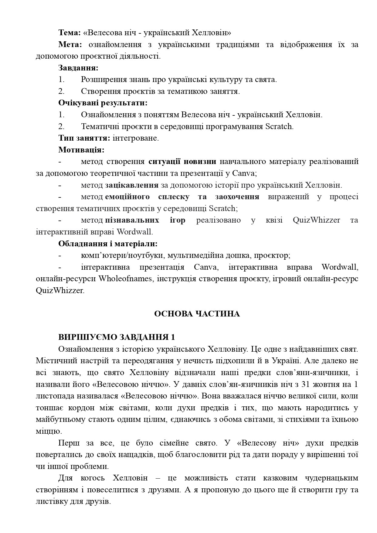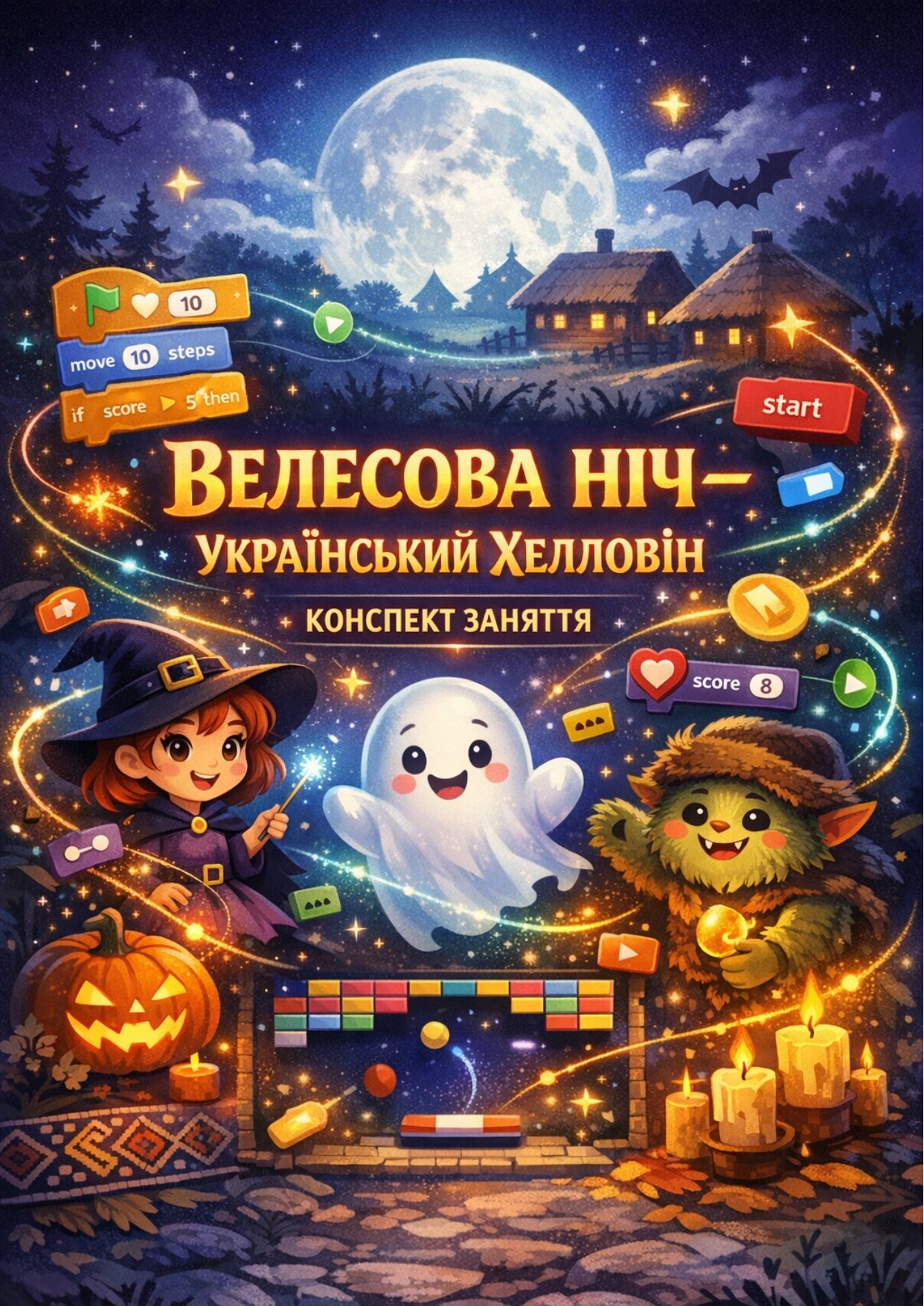 Конспект занять «Велесова ніч — український Хелловін» — це сучасний конспект інтегрованого заняття, що ставить за мету популяризацію української культури через актуальні для молоді цифрові інструменти. Матеріал дозволяє провести паралелі між популярним західним святом та автентичними українськими традиціями, перетворюючи вивчення етнографії на захопливий ІТ-проєкт.