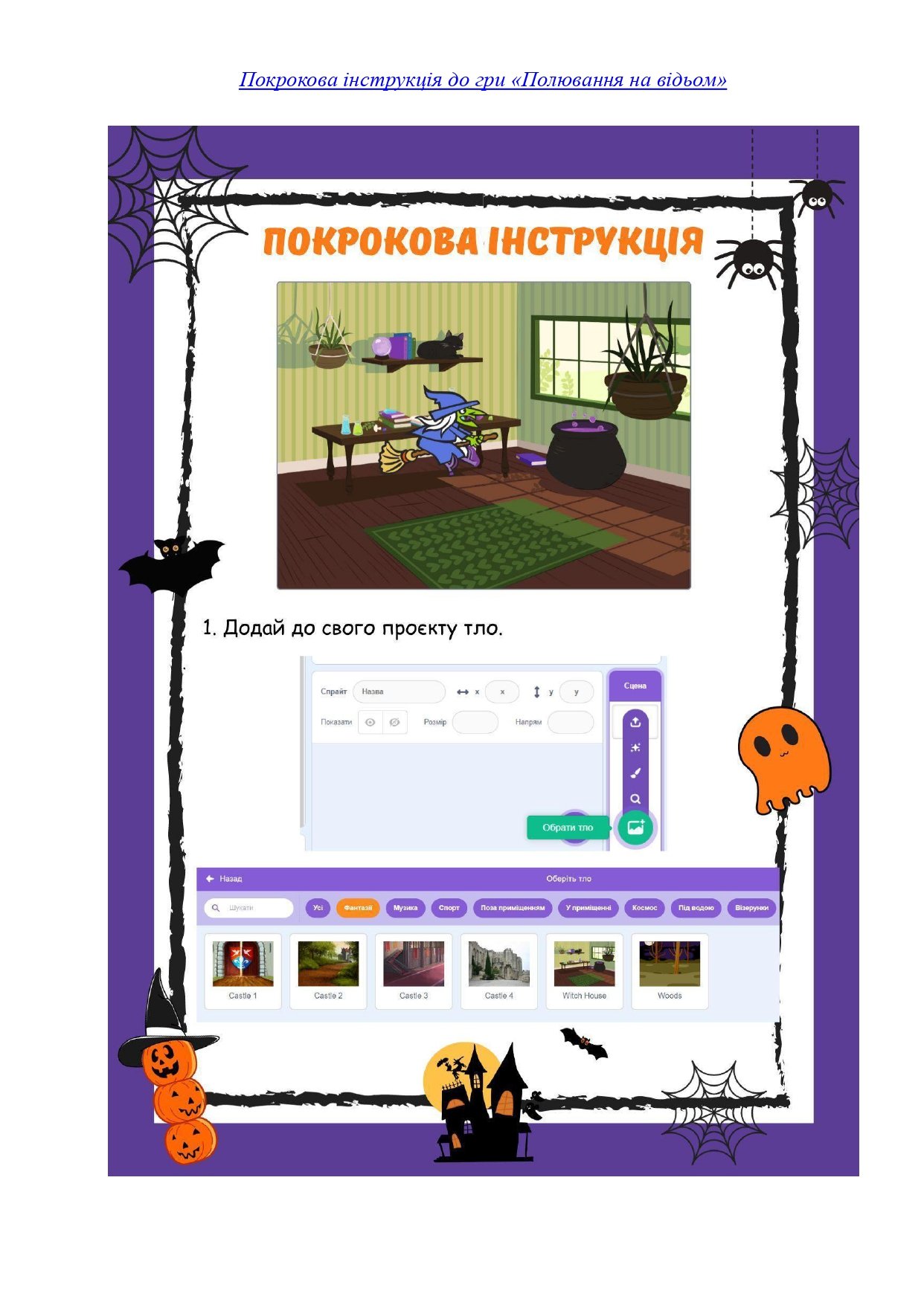 Практичне програмування: покрокова інструкція зі створення тематичних проєктів у середовищі Scratch (анімація «Жахаюча листівка» та гра-ловилка «Піймай відьму»).