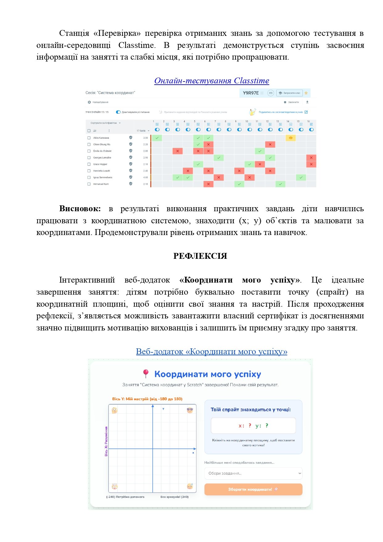 Унікальна рефлексія: Вебдодаток «Координати мого успіху», де учні ставлять «точку результату» на площині та отримують іменні сертифікати.